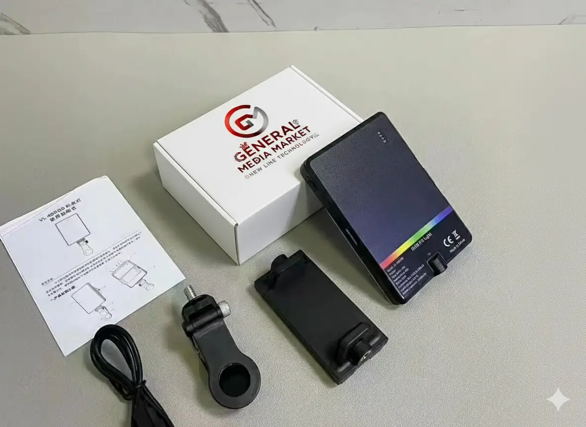 طرق التثبيت: يأتي مزودًا بمشبك أمامي وخلفي لتثبيته بسهولة على الهواتف الذكية أو أجهزة الكمبيوتر المحمولة. كما يحتوي على فتحة لولبية مقاس 1/4 بوصة في الأسفل لتركيبه على الكاميرات أو الحوامل ثلاثية القوائم (ترايبود).