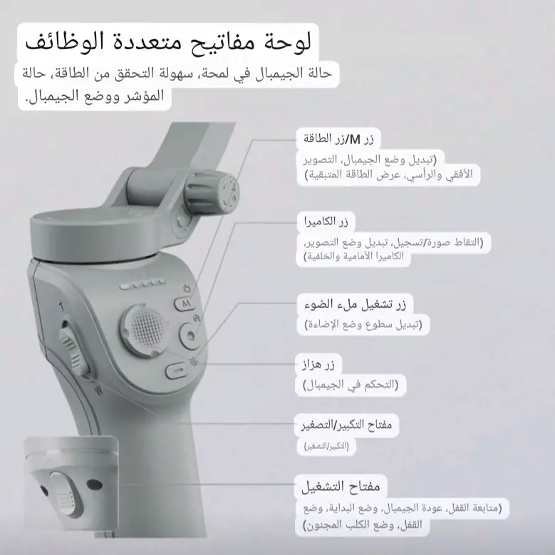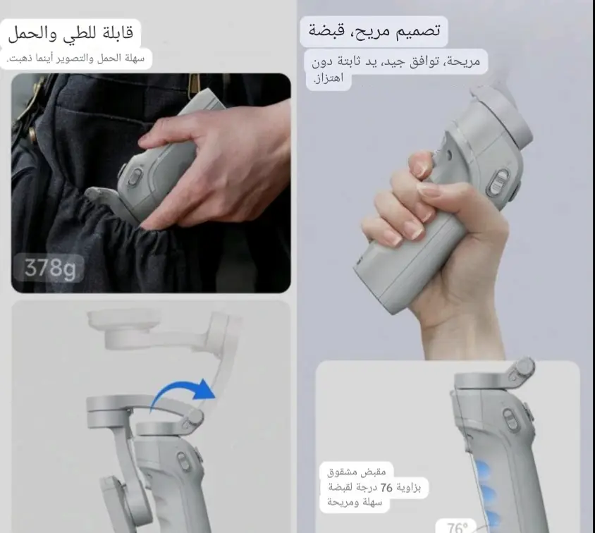 التثبيت: يوفر الجهاز تثبيتاً احترافياً ثلاثي المحاور (Pan, Tilt, Roll) للقضاء على الاهتزازات والحصول على لقطات فائقة السلاسة.