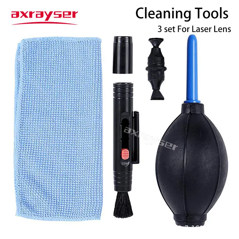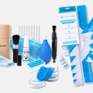 تتكون المجموعة عادةً من أداة نفخ الهواء لإزالة الغبار، وفرشاة لتنظيف العدسات، وقلم تنظيف، وقطعة قماش من الألياف الدقيقة.