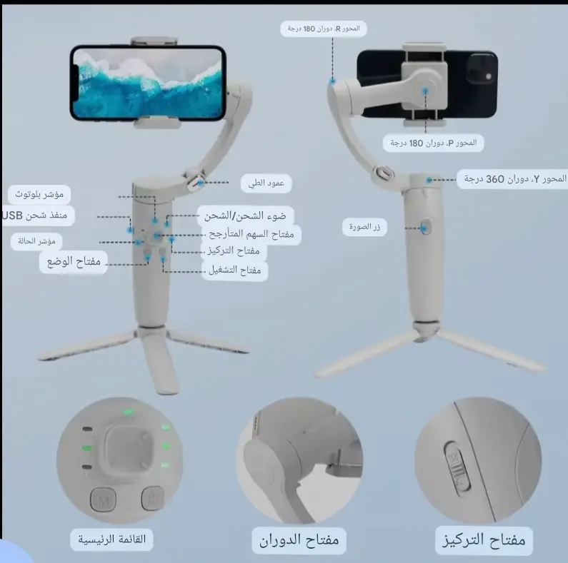 حامل ثلاثي القوائم (ترايبود) مدمج: يحتوي على أرجل مدمجة في المقبض يمكن فتحها لاستخدامه كحامل ثابت على الأسطح لتصوير أكثر استقرارًا.