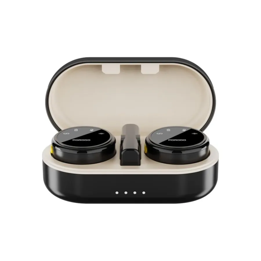 الجهاز الموجود في الصورة هو ميكروفون USB قابل للإمالة من إنتاج شركة Porodo، ويأتي مع كابل بيانات USB-C وحافظة شحن.